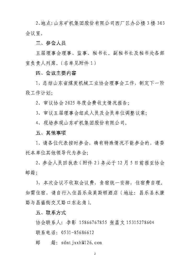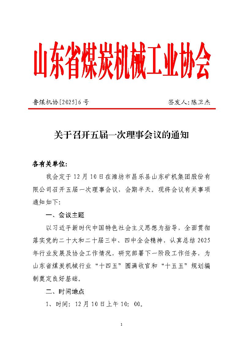 山东省煤炭机械工业协会关于召开五届一次理事会议的通知